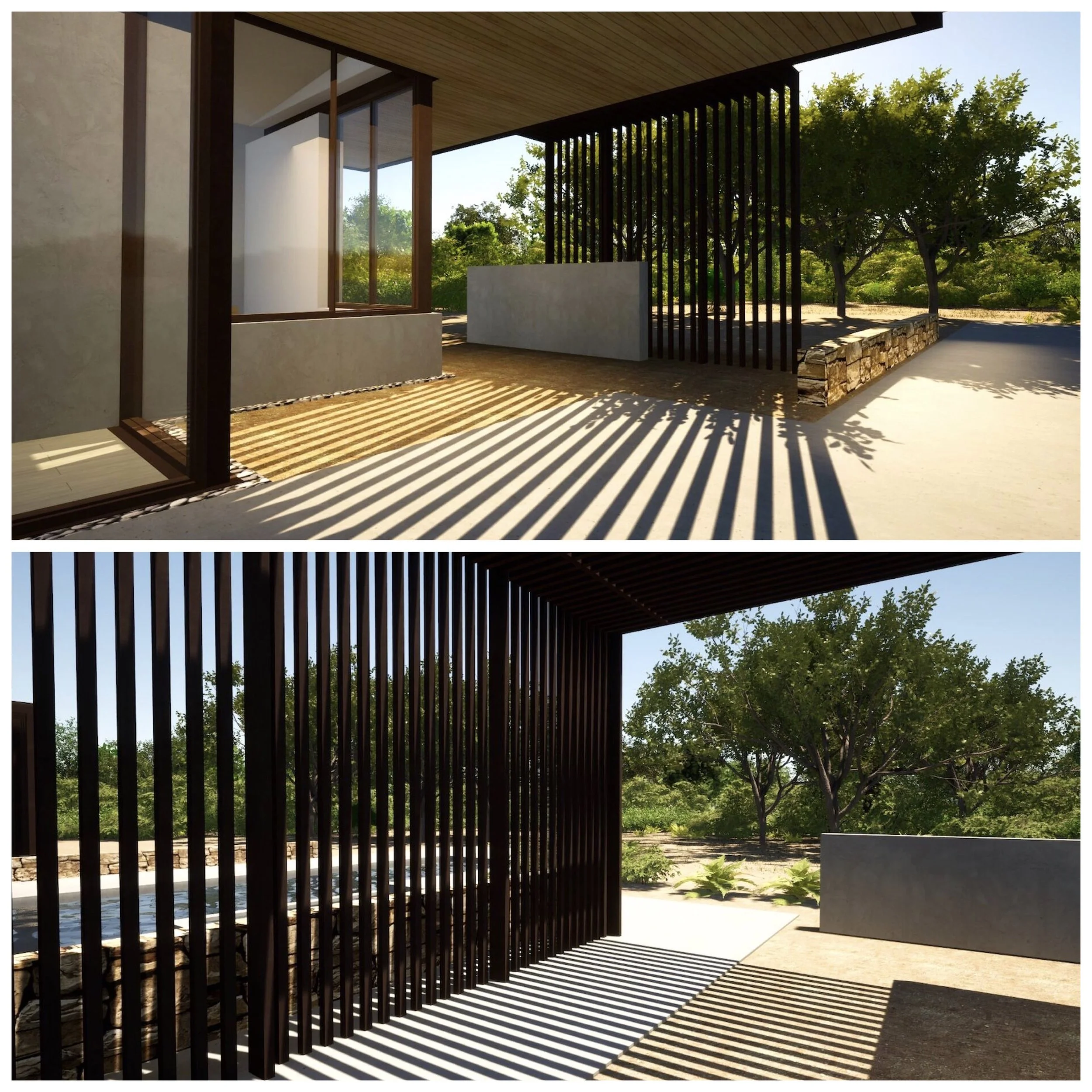 Here are some renderings of trellises. We use them to create shadow patterns. They are a layer between public and private space and they provide relief from harsh summer sun.